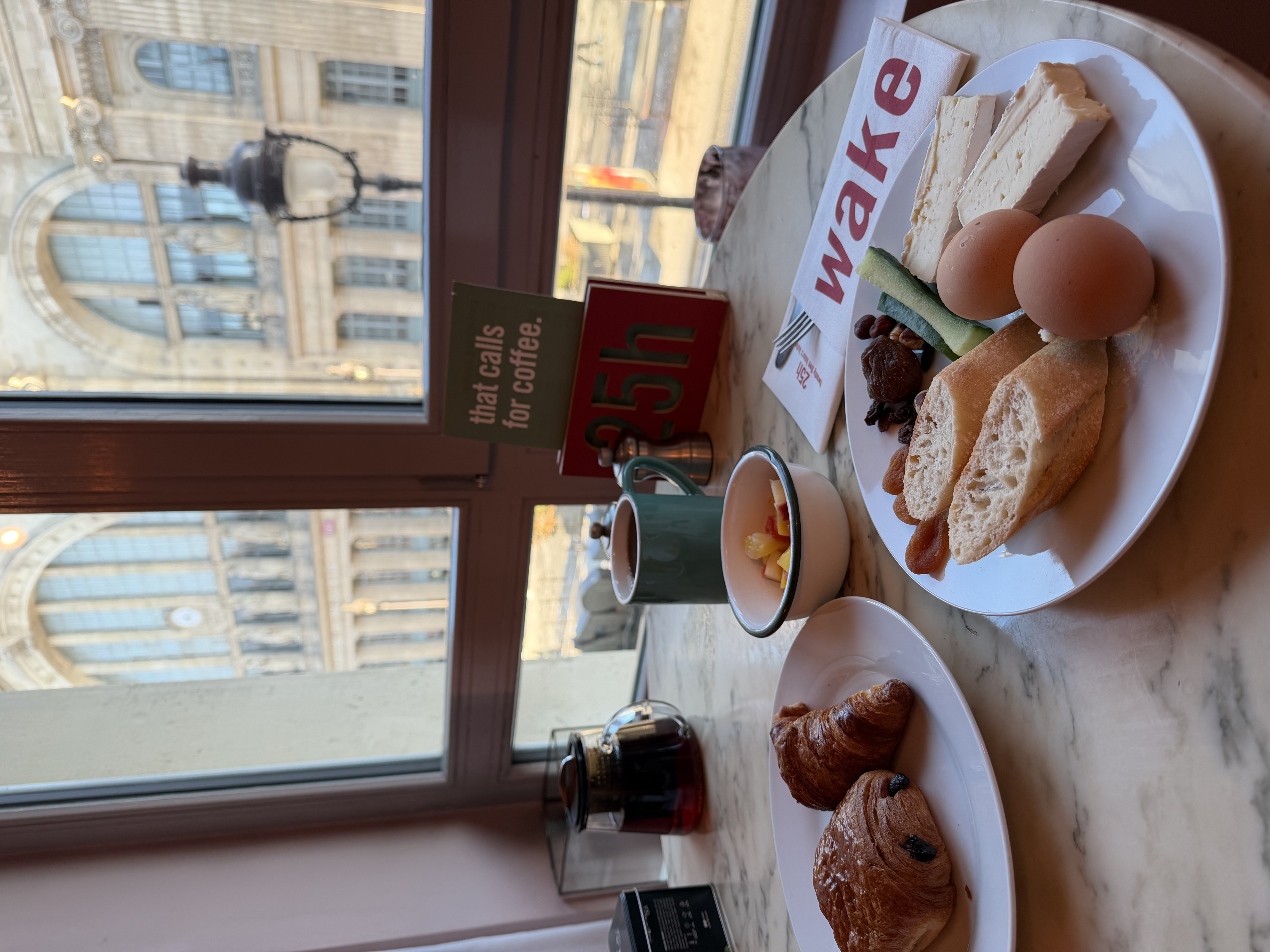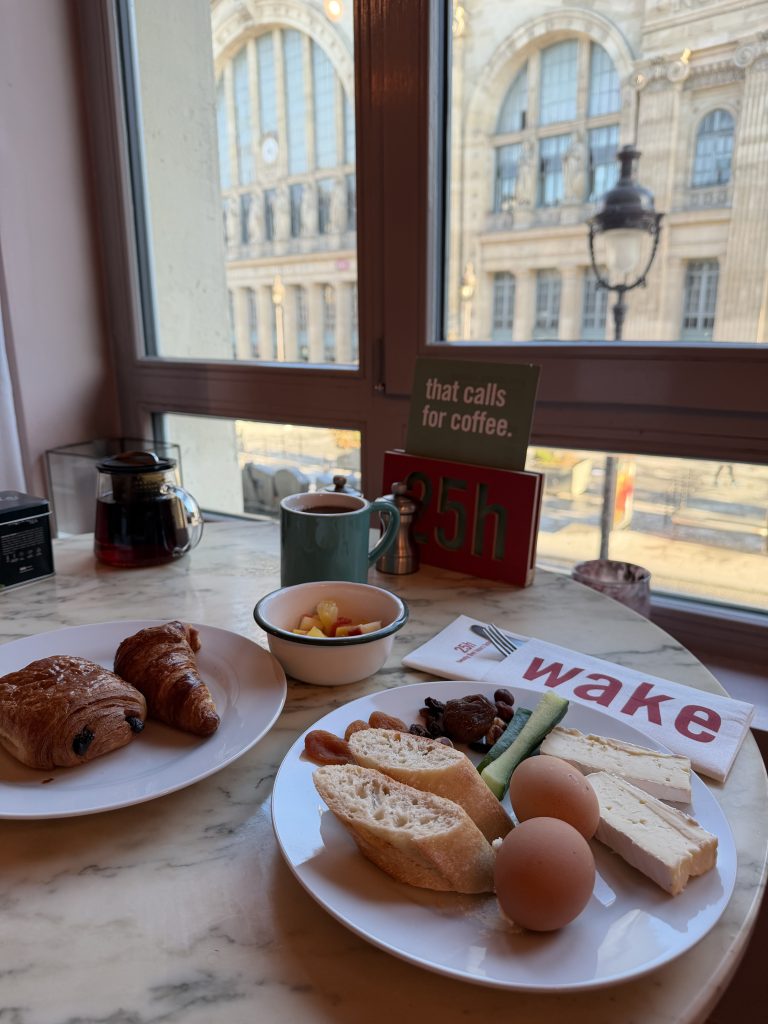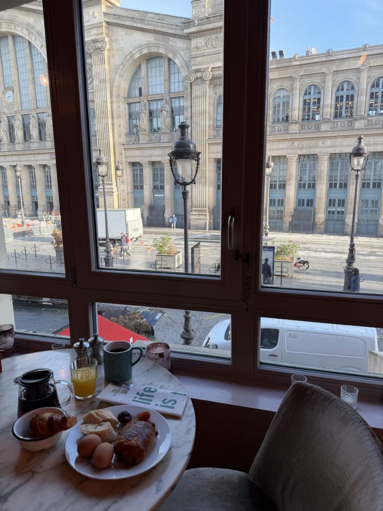 Il suffit de s’approcher du balcon pour que le décor bascule. Face à vous, la Gare du Nord. Sa façade, imposante, presque théâtrale, capte immédiatement le regard. L’agitation, les arrivées, les départs, tout continue, mais à distance. Et dans ce face-à-face silencieux, quelque chose se rééquilibre.